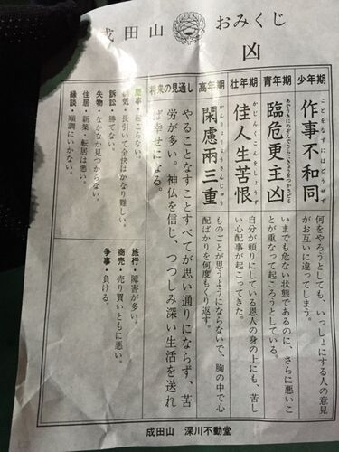 初詣にいったらなんと前厄だった 毎年恒例行事で初詣に行くんだけど、結婚してからかれこれもう10年以上深川不動尊に行っている。 これは、オレの意思って訳でもなくヨメとヨメ方の家族の意向で、郷に従う形でオレも参加してる感じ。 本来オレは信仰深い人間…